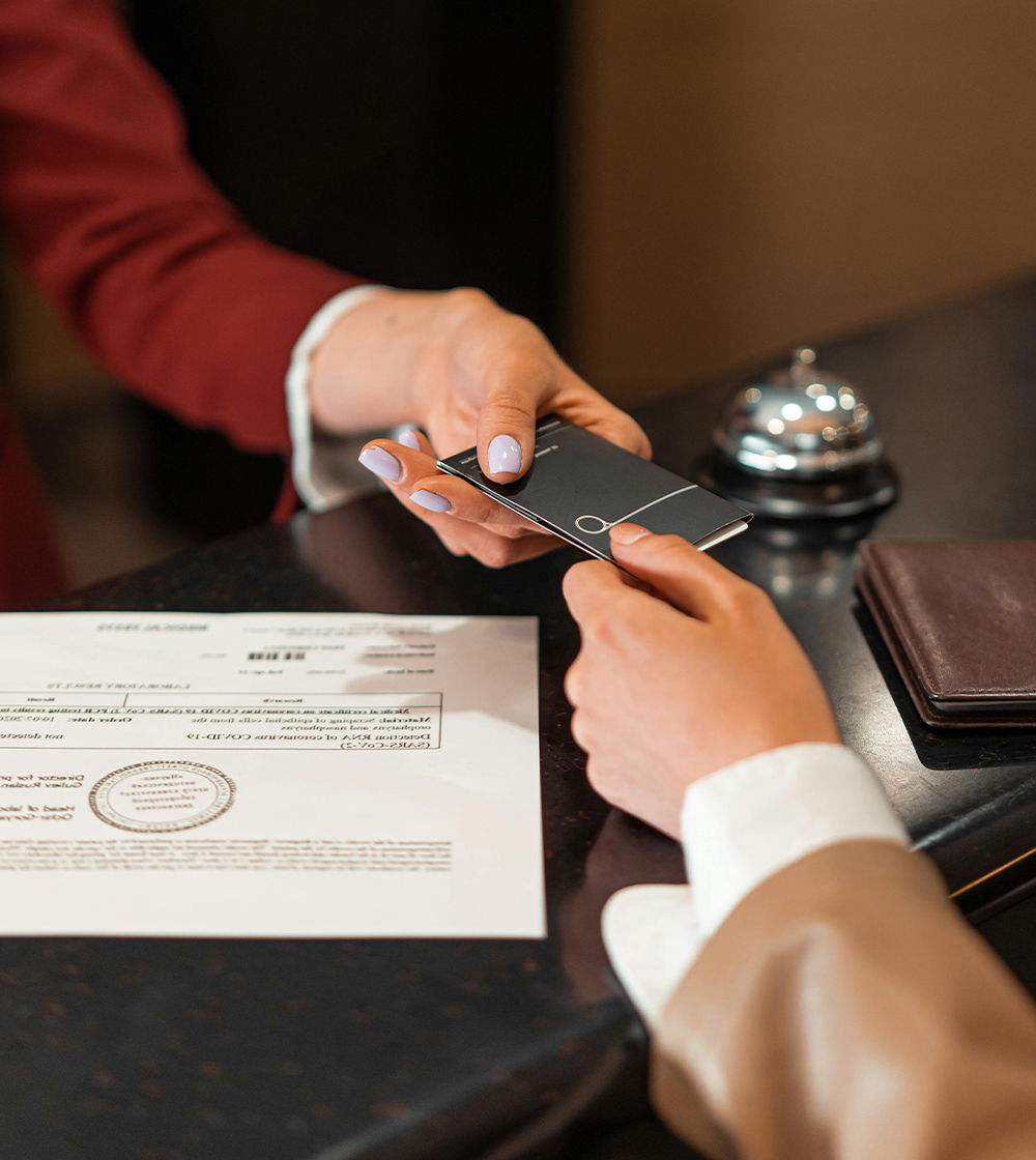 A hotel receptionist takes bookings, checks guests in and out of the hotel, allocates rooms and keys, and is the main point of contact between the guests and the staff.