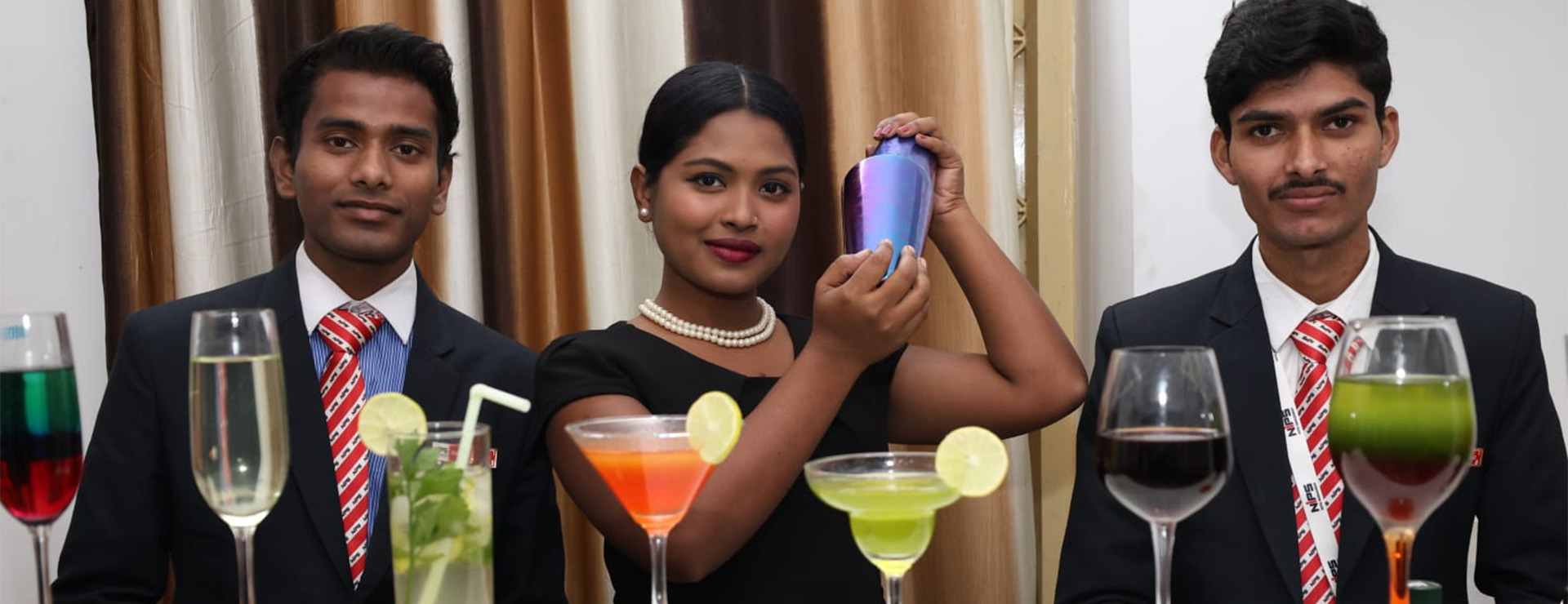 Professional hospitality education demands a balance of technical skill, creativity, and refined presentation, and this moment illustrates that blend with clarity. Students at NIPS Institute of Hotel Management Ranchi engage in a focused beverage service and mixology practical session, showcasing their growing competence in preparing and presenting a diverse range of mocktails and beverages. The poised stance of the learners and the well-arranged display of drinks reflect their understanding of colour balance, layering techniques, garnishing standards, and the use of appropriate glassware—key components in modern bar operations.