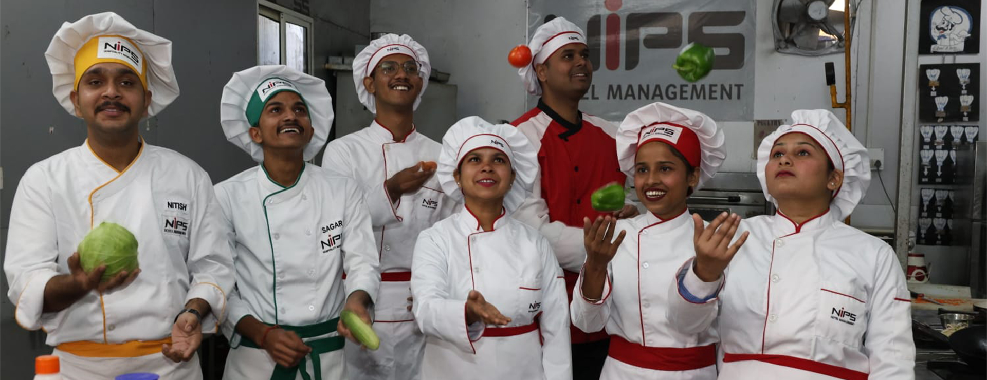 Culinary education at NIPS Institute of Hotel Management, Ranchi, is grounded in hands-on learning, creativity, and a strong commitment to professional grooming. The image highlights a vibrant moment from the institute’s training kitchen, where students—dressed in full chef attire—actively engage in a practical session that blends skill-building with enthusiasm. Their confident handling of fresh ingredients reflects the emphasis NIPS places on developing precision, coordination, and familiarity with produce, all of which are essential for future chefs working in fast-paced, high-standard culinary environments.