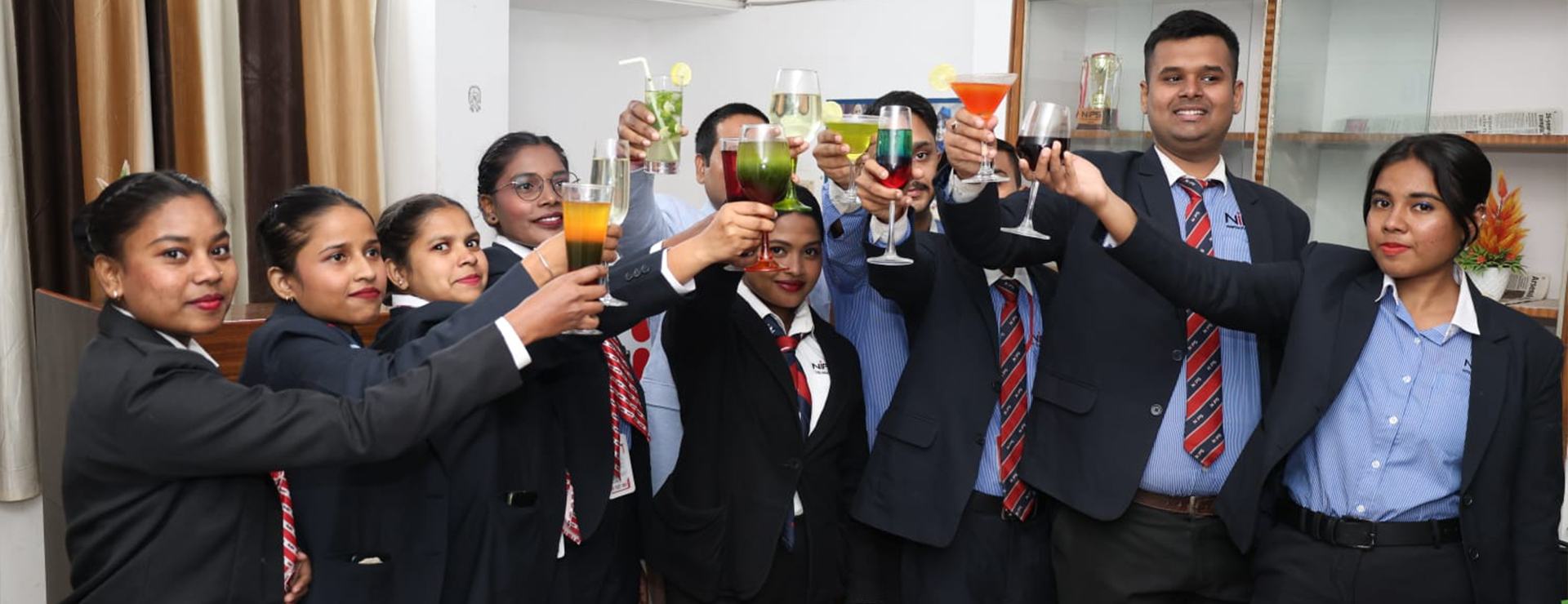 Professional hospitality training thrives on experiential learning, and this moment reflects the enthusiasm and teamwork that define the student community at NIPS Institute of Hotel Management Ranchi. As students raise their glasses during a practical beverage service session, they demonstrate not only their understanding of presentation techniques but also their ability to collaborate and support one another in a real-world service environment. Skills such as correct glassware selection, garnishing, balance of colours, and serving etiquette are deeply embedded in these sessions, helping learners develop a strong foundation for careers in bars, restaurants, lounges, and luxury hotels.