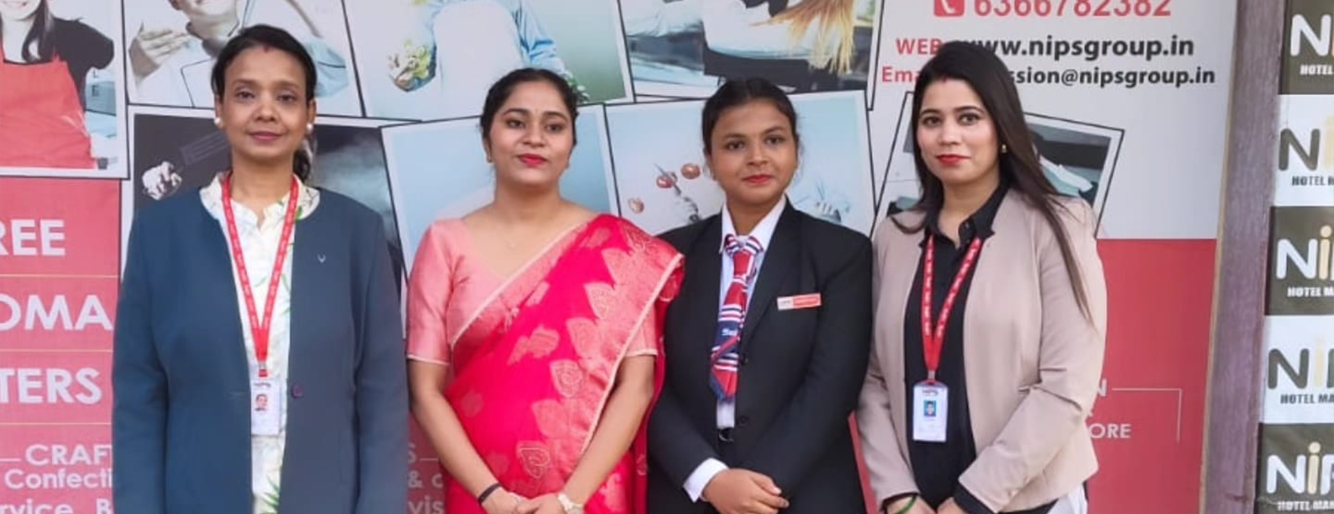 NIPS Institute of Hotel Management, Ranchi, continues its commitment to nurturing well-groomed, industry-ready hospitality professionals through consistent academic guidance and structured professional development. The image highlights a fine example of this ethos—where a student, impeccably dressed in formal hospitality attire, stands alongside three esteemed faculty members who play a central role in shaping student growth on campus. Their presence together reflects the institute’s strong culture of mentorship, discipline, and personalized support, which ensures that every learner receives the right blend of theoretical understanding and practical exposure.
